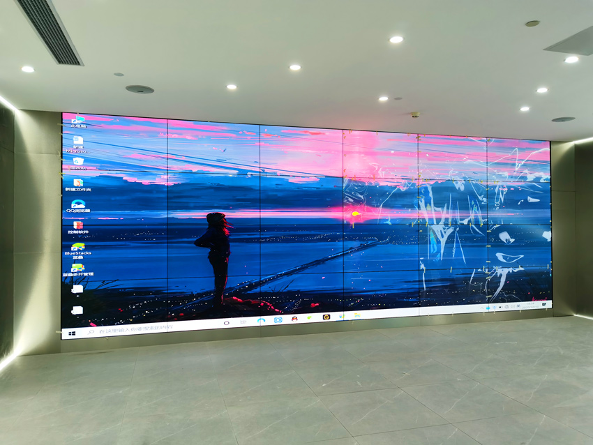 此項目由4×6的55寸1.7mm拼接屏在廣州天河區某公司展廳投入使用,顯示效果超過客戶預期。該用戶在CBD甲級寫字樓辦公,采用24塊1.7mm拼縫的拼接屏。